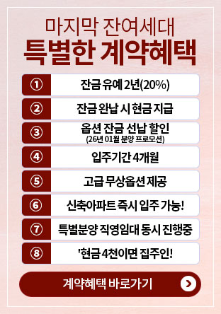 - 트렌드에 맞춘 6.1m광폭 거실 설계와 발코니 특화설계로 더 넓어진 실사용 면적 - 입주까지 계약금 1,000만원, 잔금 유예 2년 무이자 혜택 제공 - 약 1,300만원 상당의 고급 무상옵션 제공 - 기존주택 처분과 신학기를 고려한 여유로운 입주기간 4개월